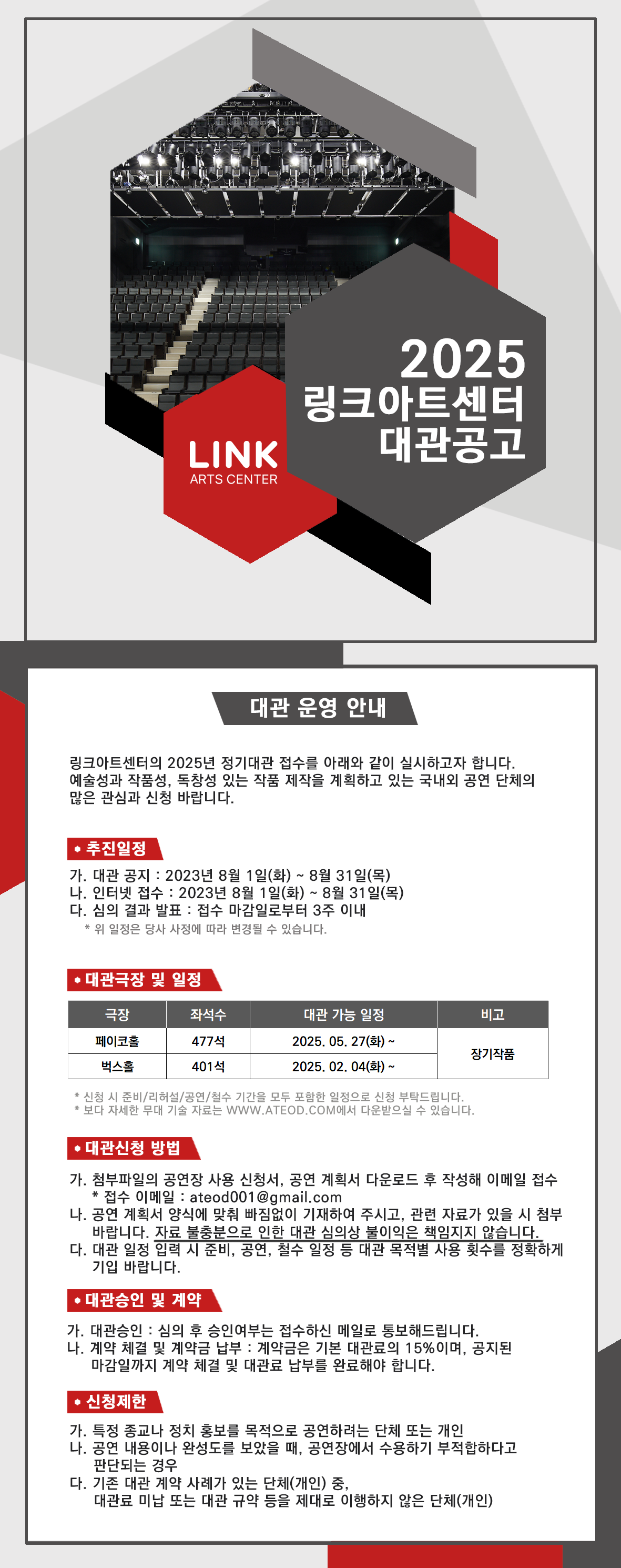 링크아트센터의 2025년 정기대관 접수를 아래와 같이 실시하고자 합니다.