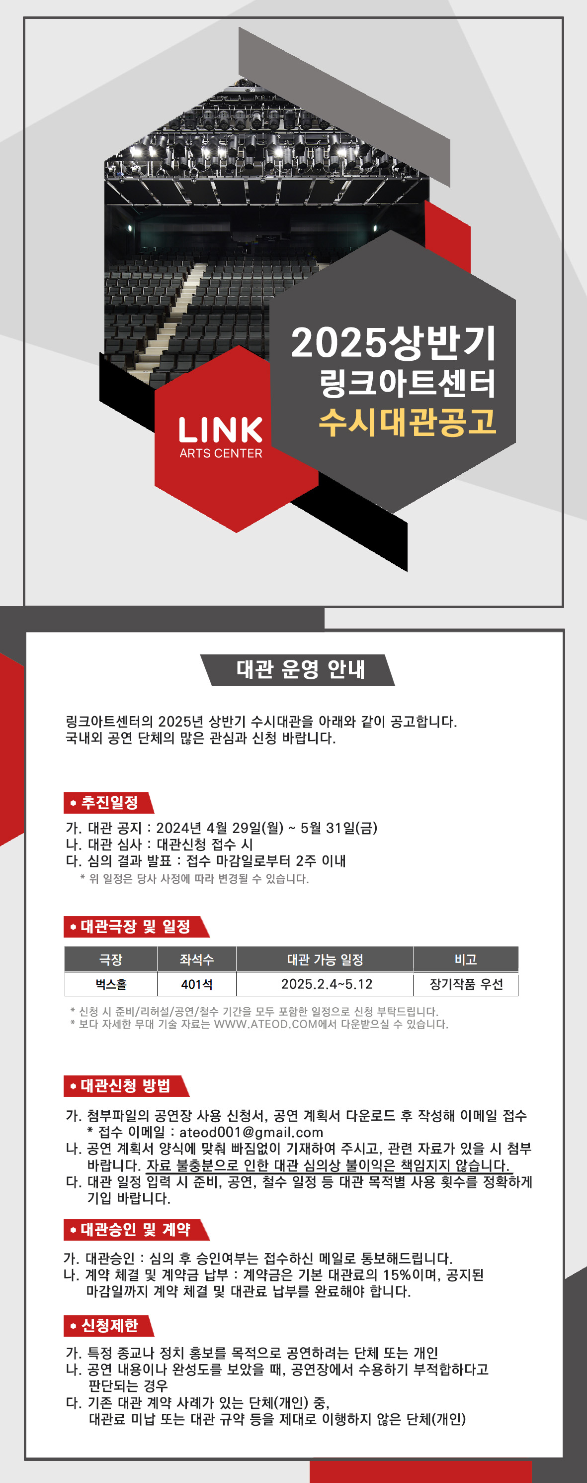 링크아트센터의 2025년 상반기 수시대관 접수를 아래와 같이 실시하고자 합니다.